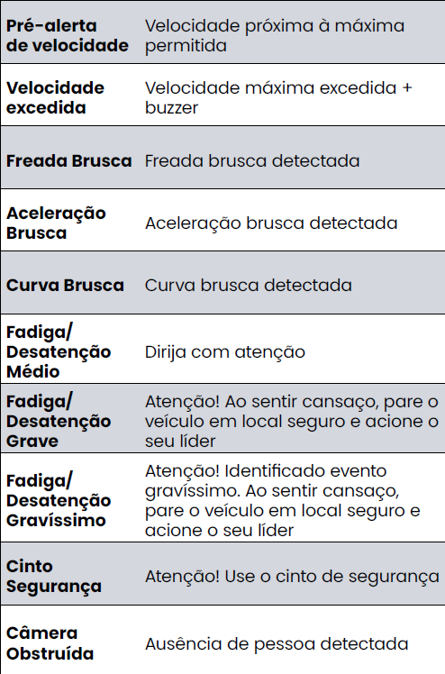 Para te auxiliar na condução do veículo, você receberá mensagens de voz dentro da cabine. Essas mensagens vão te alertar sobre: