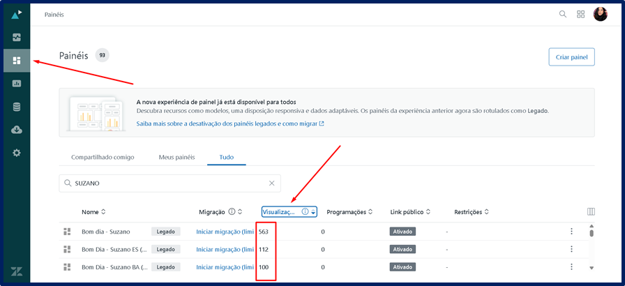 Clicando na aba PAINÉIS – filtrando pelo nome de uma EMPRESA e clicando em VISUALIZAÇÕES, você terá uma listagem dos painéis mais acessados, até os menos acessados;