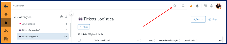 Dentro do painel de “VISUALIZAÇÕES” do Zendesk, você irá clicar no ícone de LUPA para filtrar o nome da empresa que deseja visualizar o URL de BOM DIA.