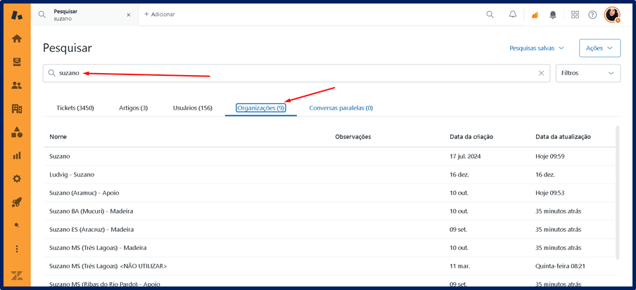 Após filtrar o nome da Empresa desejada, clica na aba ORGANIZAÇÕES e você terá uma listagem de todas existentes.