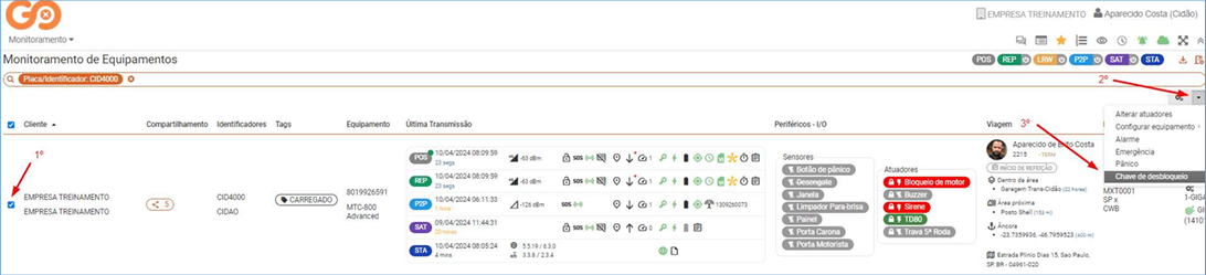 Na tela inicial, selecione a linha da placa desejada e depois clique no canto superior direto “ícone ” e selecione a opção “Chave de Desbloqueio”: