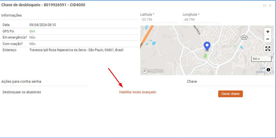 Quando a sequência gerada no terminal pelo motorista for inserida na interface do GO, vai abrir a tela abaixo, você deverá clicar em “Habilitar modo avançado”: