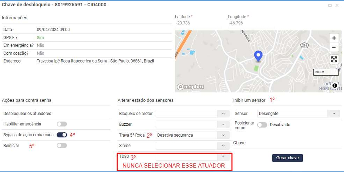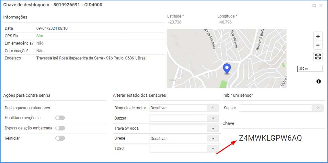 Será gerada uma sequência de letras e números que o motorista deverá informar à central de monitoramento, que por sua vez, irá gerar a uma chave com os itens que deverá atuar no veículo:
