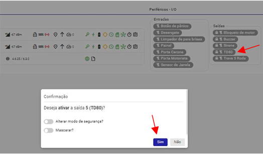 *TD80 é o Terminal de Dados, NÃO deve ser selecionado, pois o motorista poderá desligar o TD indevidamente e ficar sem acesso a realizar procedimento de envio de macros. Caso isso aconteça a central consegue ligar novamente o TD desde que o veículo esteja com sinal. Para ligar o TD80, basta clicar no nome do periférico em saídas, vai questionar se “Deseja ativar a saída 5 (TD80)” clique em sim: