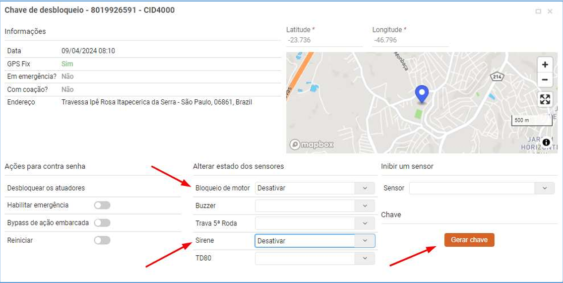 Nos atuadores “Bloqueio de motor” e “Sirene” selecione “Desativar” e clique gerar chave: