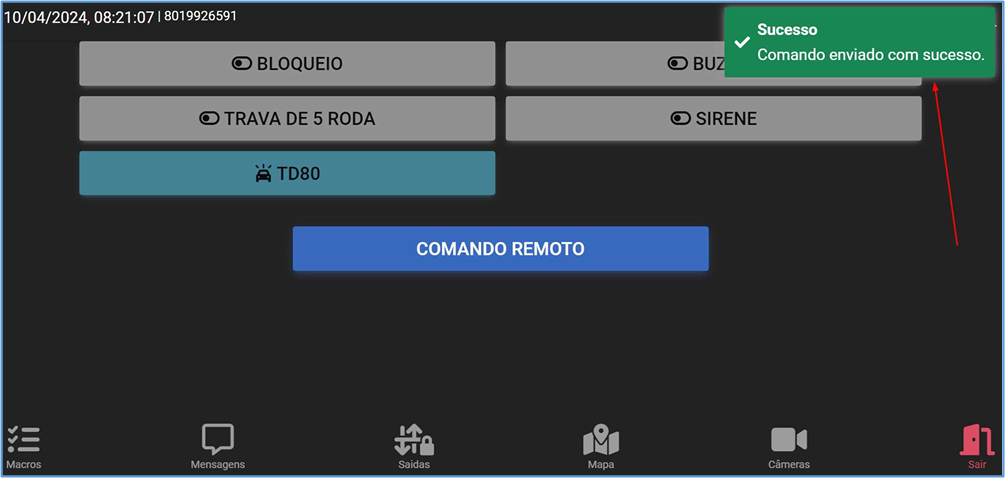 Após clicar em confirmar vai aparecer a informação “Comando enviado com sucesso” no terminal de dados: