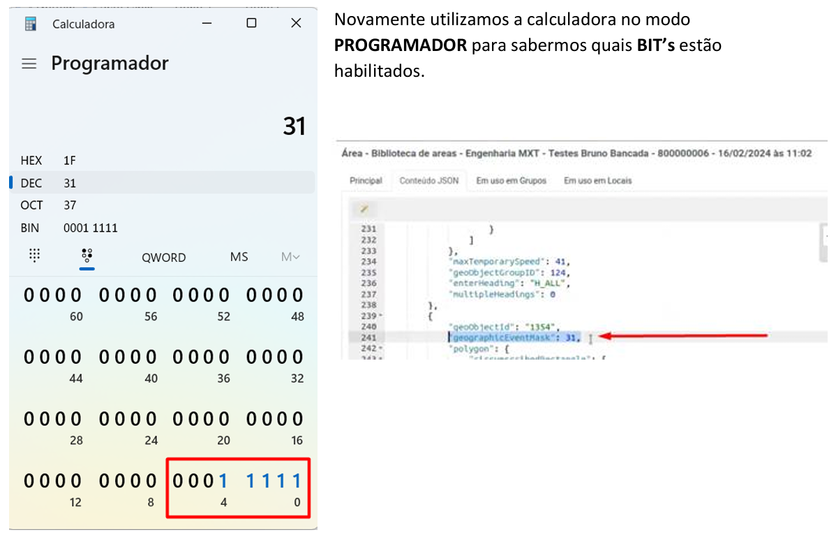 OBS: Caso tenha dúvida sobre a somatória dos pontos cadastrados, colocar os valores registrados na calculadora, no modo PROGRAMADOR e ir somando as direções + borda.