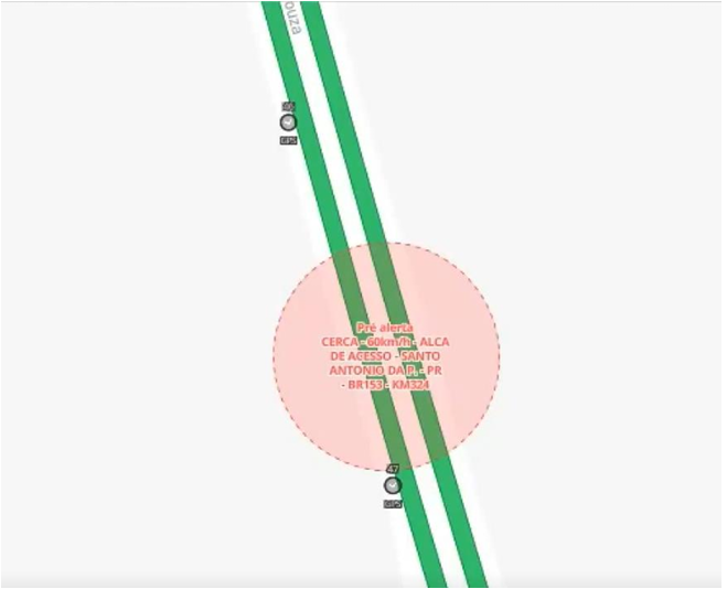 - Se o veículo passa por um pré-alerta em alta velocidade, pode acontecer do equipamento reportar a ele, somente antes e depois que ele passar pelo pré-alerta, considerando então como se ele não “tivesse entrado” naquele ponto.