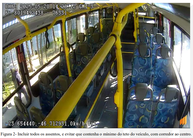 - Câmera 6 (C6): Fundos – Incluir todos os assentos, e evitar que contenha o mínimo do teto do veículo, com corredor ao centro.