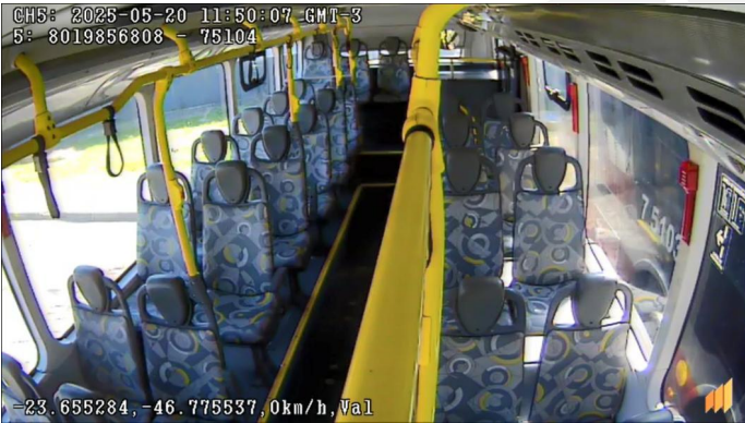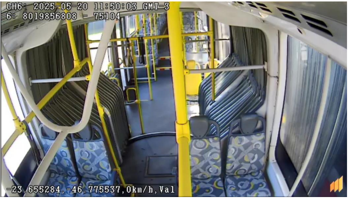- Câmera 3 (C3): devido à alteração no layout, a câmera está levemente centralizada, capturando o corredor até o fundo do veículo. Ainda assim, é necessário que registre parcialmente a área do cobrador, utilizando como referência a cadeira e o validador;