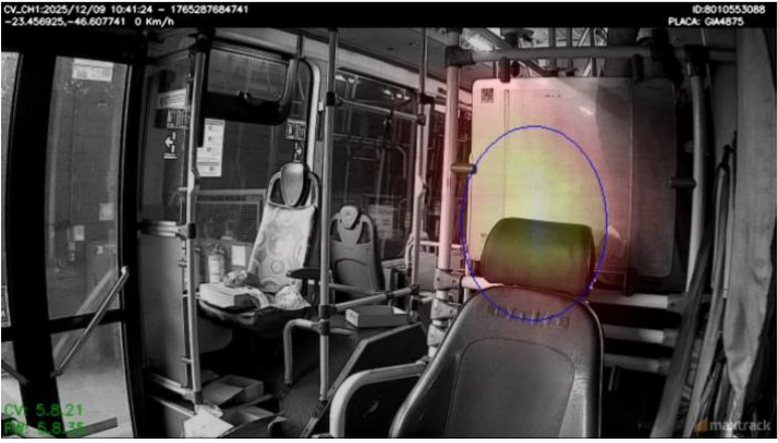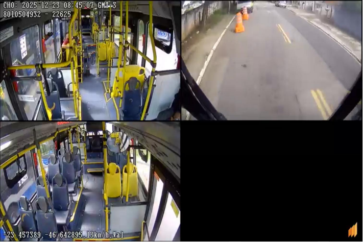 - Câmera 3 (C3): Visão dos fundos, não contempla cobrador, do corredor ao centro da imagem, de forma que será possível ver todo o corredor e ao final da imagem ao centro, os assentos encostados nos fundos.