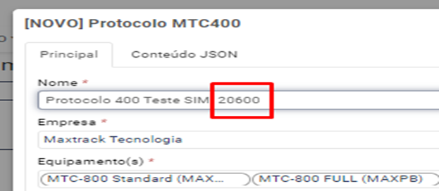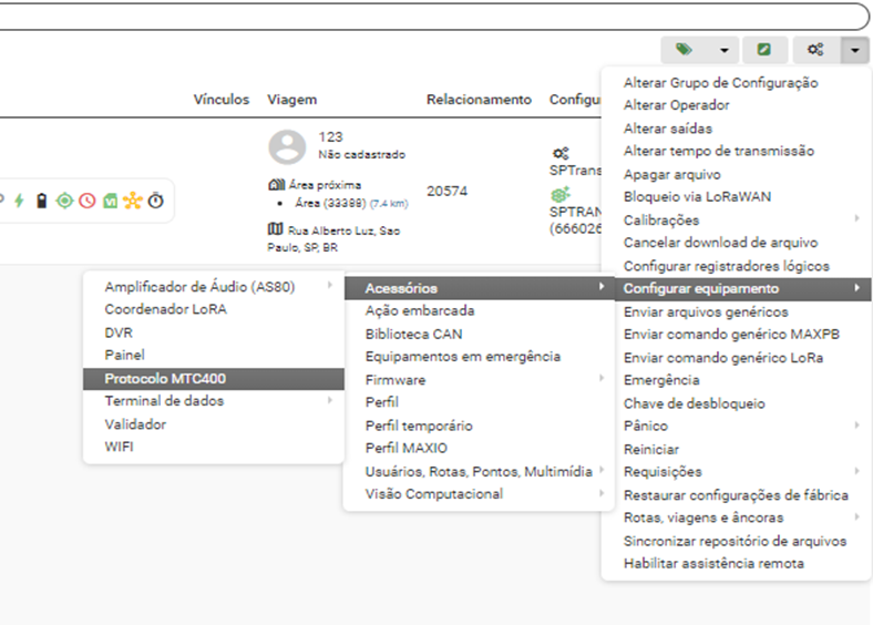 Na opção opção de envio de comando vai seguir o caminho de engrenagem > configurar equipamento > acessórios> protocolo MTC400 (conforme print):