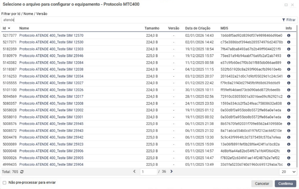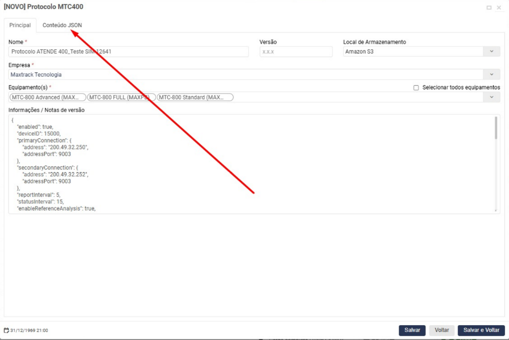Na opção opção de envio de comando vai seguir o caminho de engrenagem > configurar equipamento > acessórios> protocolo MTC400 (conforme print):