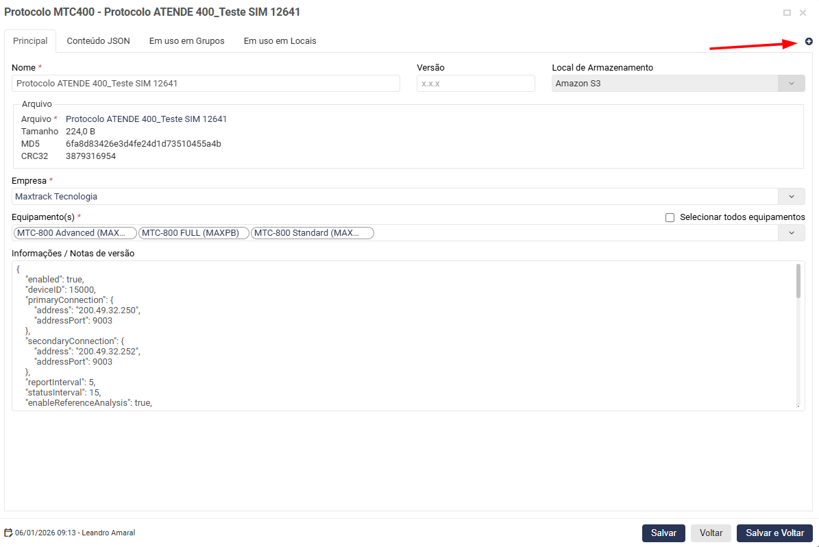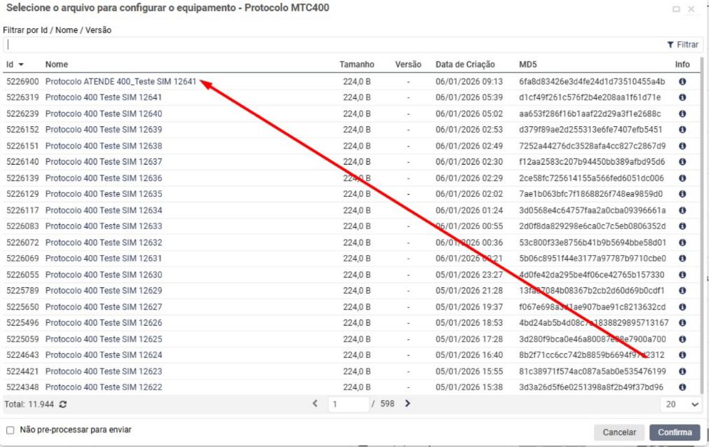 Ira apresentar o novo protocolo criado, click na parte em branco da linha do protocolo criado e depois click no botão    o protocolo criado será enviado para o veículo.
