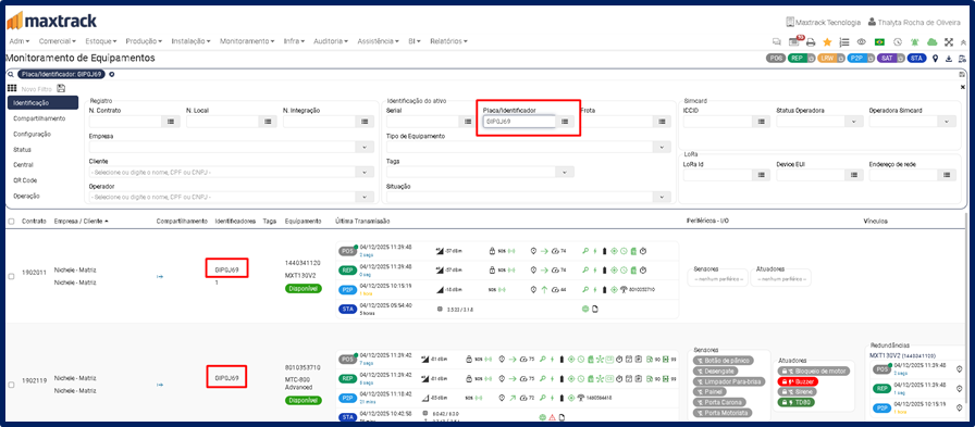 3. Digitar a placa do veículo no campo de busca, e o sistema exibirá as informações técnicas do equipamento referente à placa selecionada.